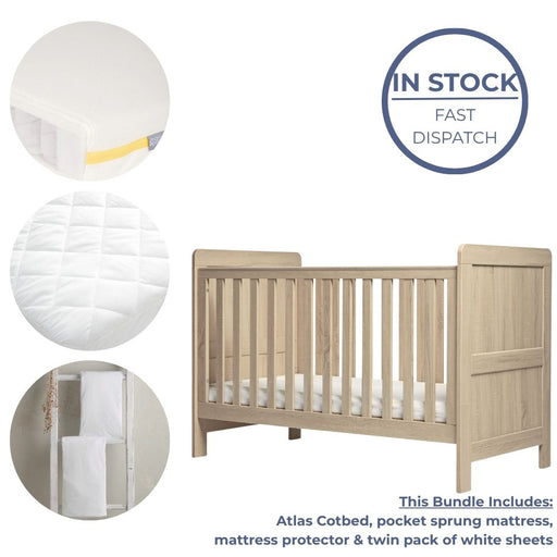 This Bundle includes: Atlas Cotbed - Light Oak, Dresser Changer - Light Oak, Cotbed Essential Airflow Pocket Spring Mattress, Cotbed Fitted Sheets ...