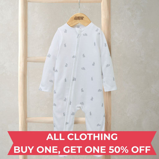View full detailsThis bunny print onesie is made from 100% cotton. Its long sleeved with integrated turn back scratch mitts & a full zipper opening. From newbor...