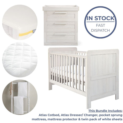 View full detailsThis Bundle includes: Atlas Cotbed - White, Dresser Changer - White, Cotbed Essential Airflow Pocket Spring Mattress, Cotbed Fitted Sheets (2 Pack)...