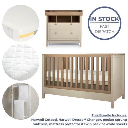 Harwell 3 Piece Baby Cot Bed Set - Cotbed + Dresser + Mattress Add a touch of playfulness to your little one's nursery with our Harwell furniture r...