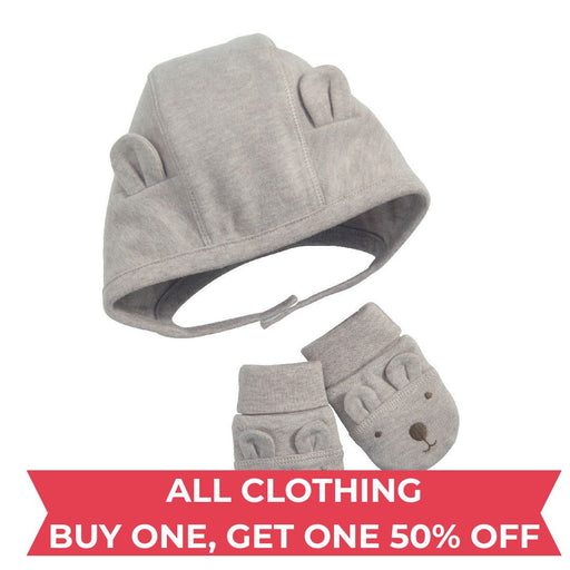 View full details2-piece hat and mitts set, in super soft oatmeal marl fabric. Adorable bonnet-style hat with easy velcro fastening and cute ear detail. Mitts featu...